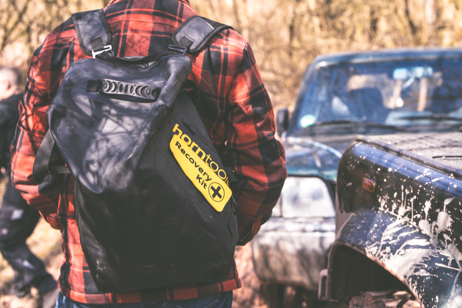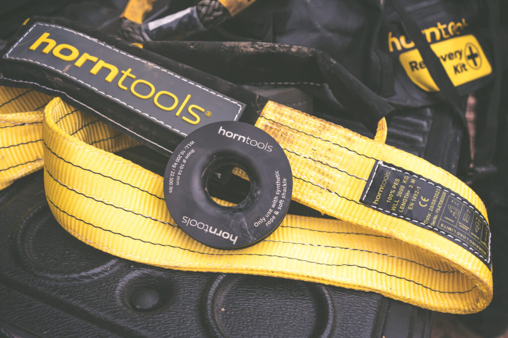 - Die dritte Stufe ist das Rausziehen mit einem anderen Fahrzeug. Verbindet die Fahrzeuge mit dem starren Gurt oder dem Seil aus dem horntools Recovery Set. Das Zugfahrzeug fährt behutsam an, das Seil wird langsam auf Spannung gebracht. Das ist die sanfteste und schonendste Art der Bergung mit Hilfe eines anderen Fahrzeugs. Hier ist keine Dynamik drin. Geht es nicht weiter oder drehen die Räder des Zugfahrzeugs durch, nicht weitermachen, nächste Technik wählen.