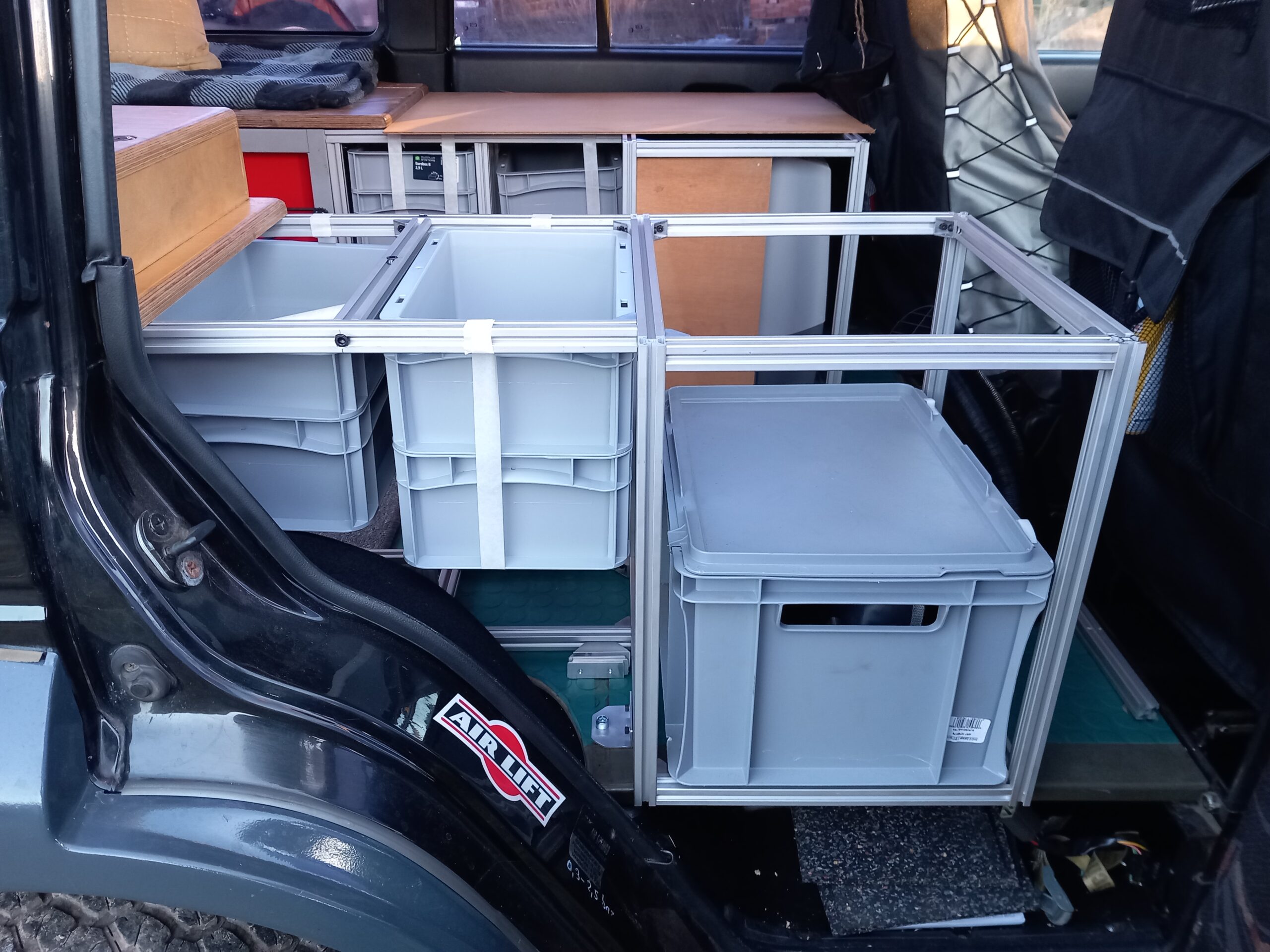 Aluprofile und praktische Euroboxen als Stauraum im Innenraum.
