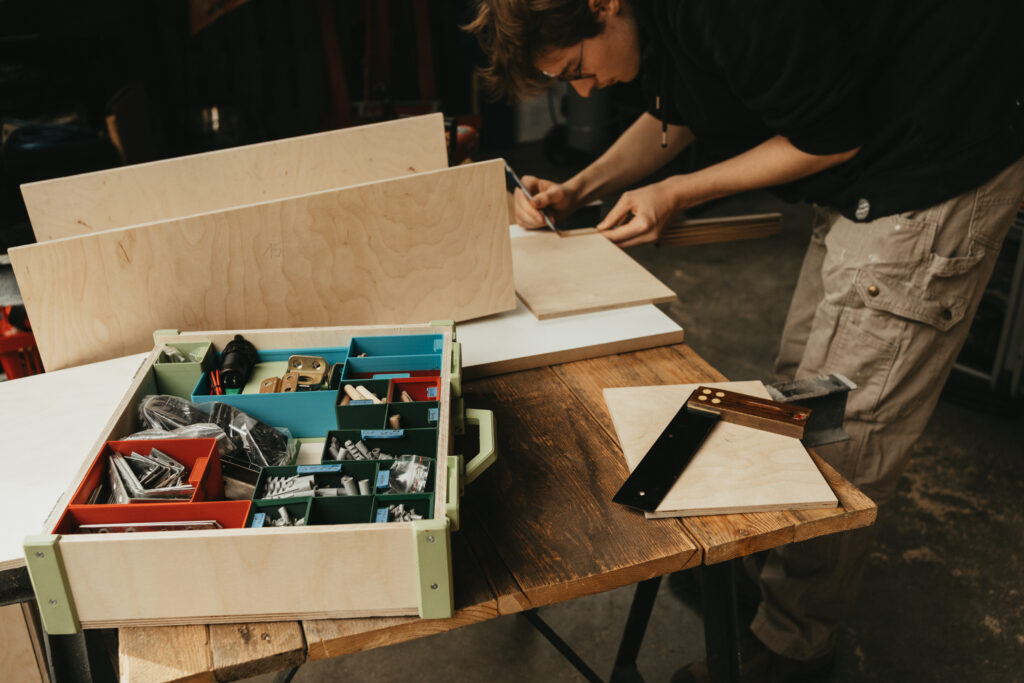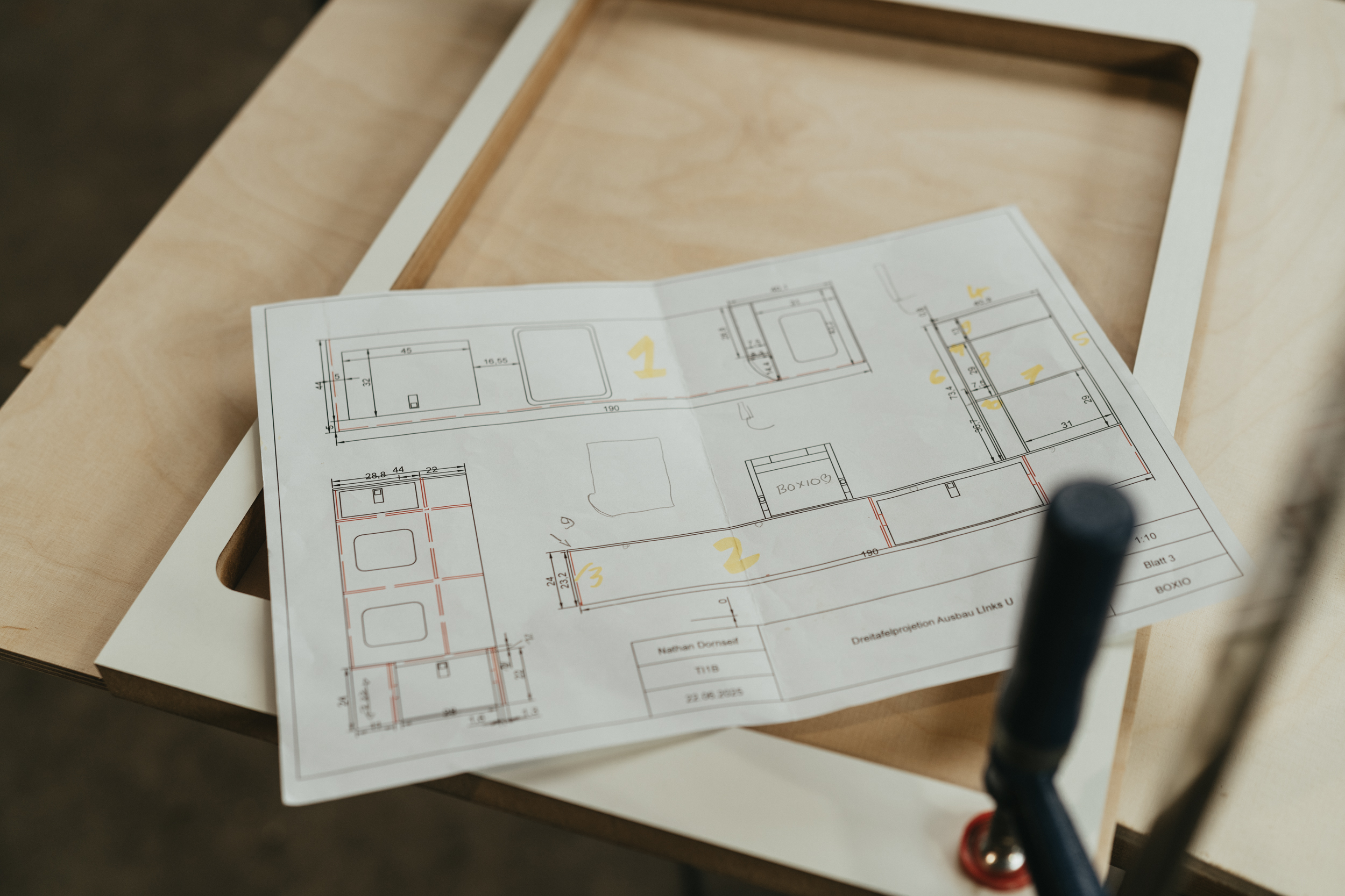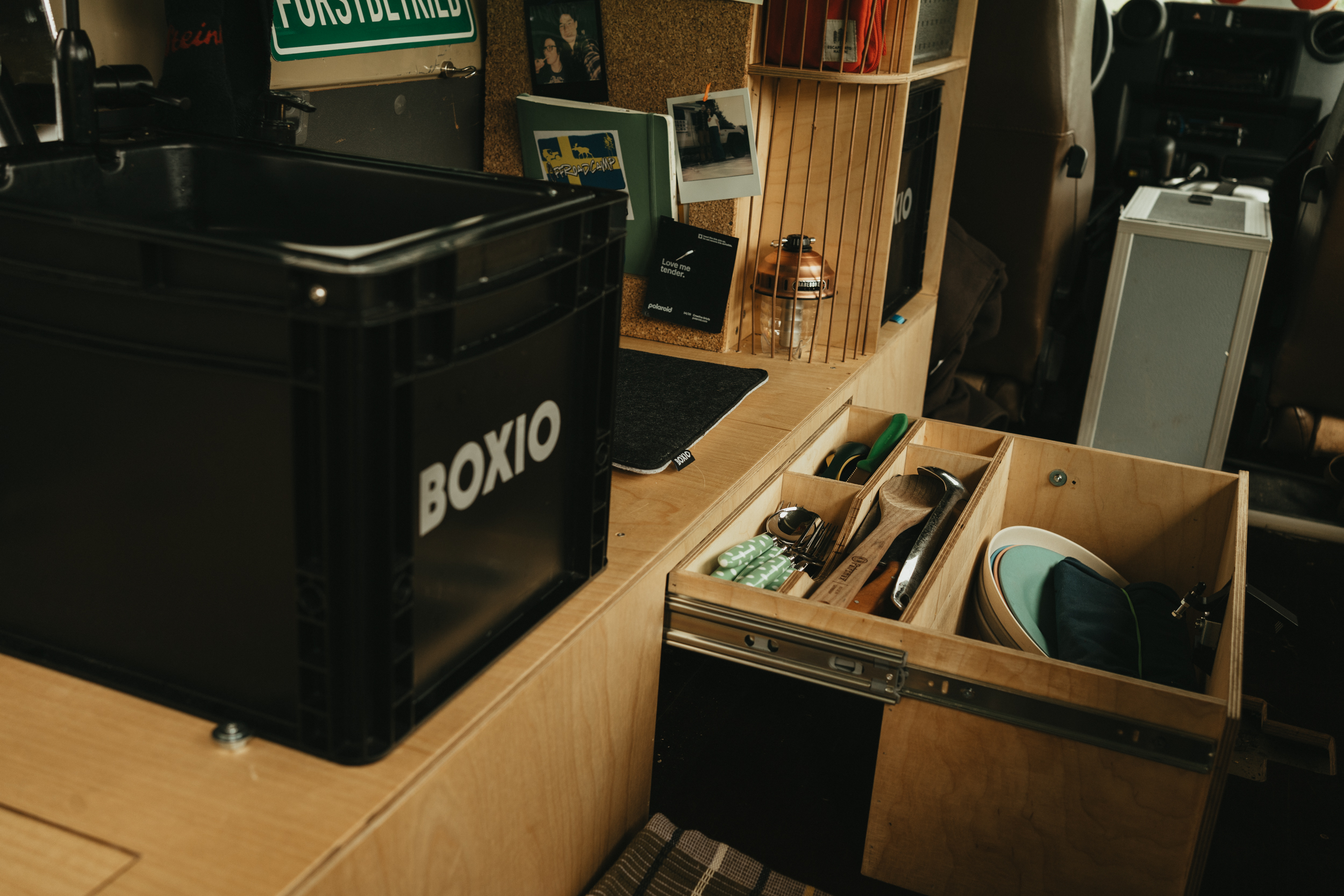 Etwa drei Monate arbeitete Nathan an seinem Ausbau. Immer dann, wenn zwischen Berufsschule und seiner Arbeit etwas Zeit blieb, schnitt er in der Werkstatt die Teile zu. Den Feinschliff und den Einbau hat er an zwei langen Wochenenden umgesetzt. Bei der Materialwahl setzte er bewusst auf Schlichtheit: Birke-Multiplex, schwarze Beschläge, Druckfederknöpfe und als Herzstück die BOXIO-Module.