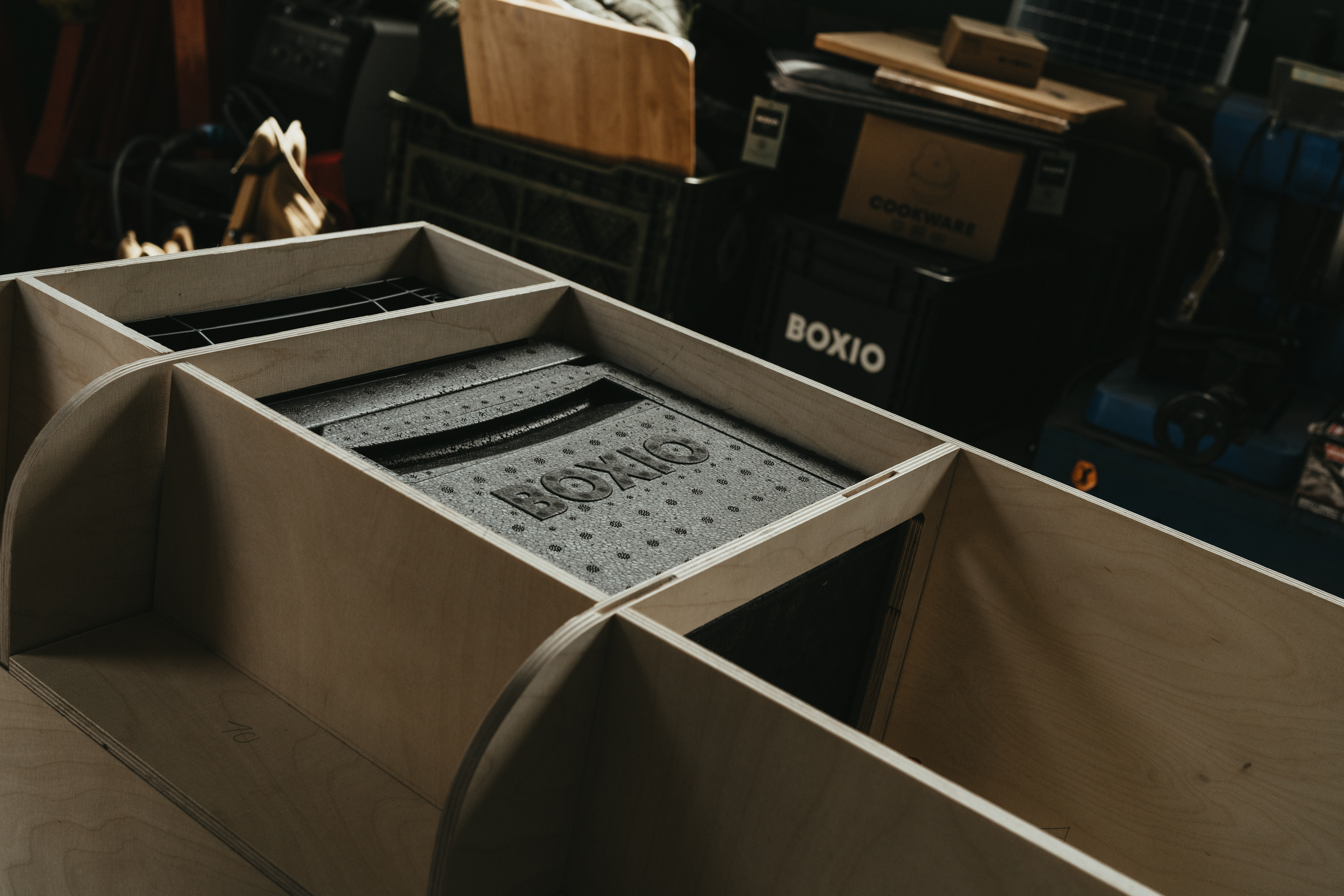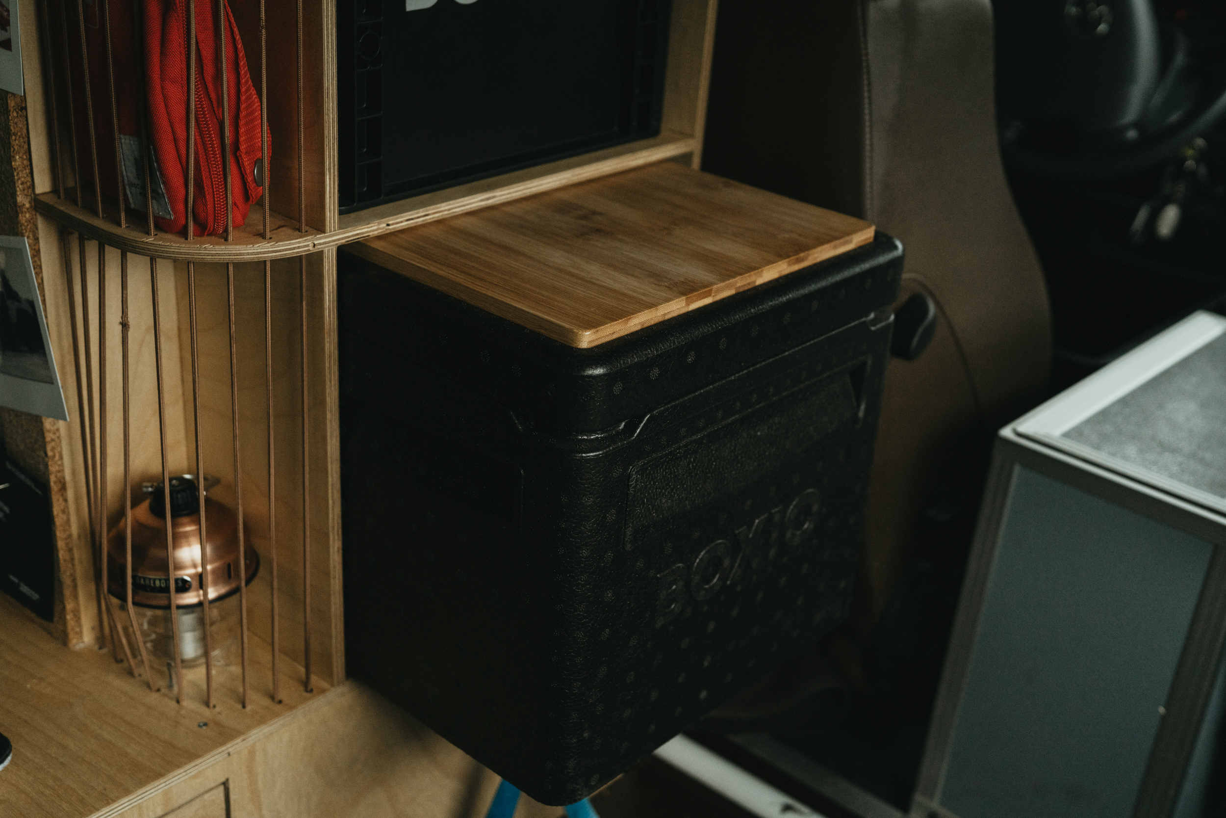 Das Lieblingsteil des Ausbaus ist für Nathan auf jeden Fall das hohe Seitenschrankmodul. Auf der einen Seite ist es ein Regal, in dem Platz für drei weitere Boxen ist. Hier die BOXIO TOILET, die Trenntoilette untergebracht, die BOXIO COOL, eine passive Kühlbox, und eine weitere Kiste.