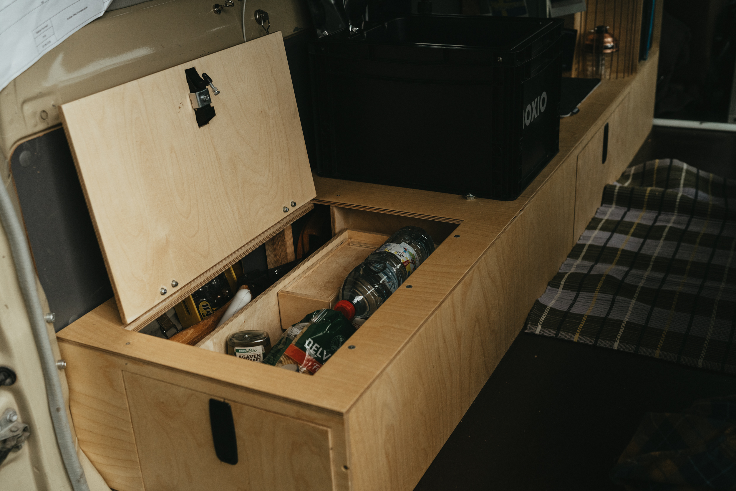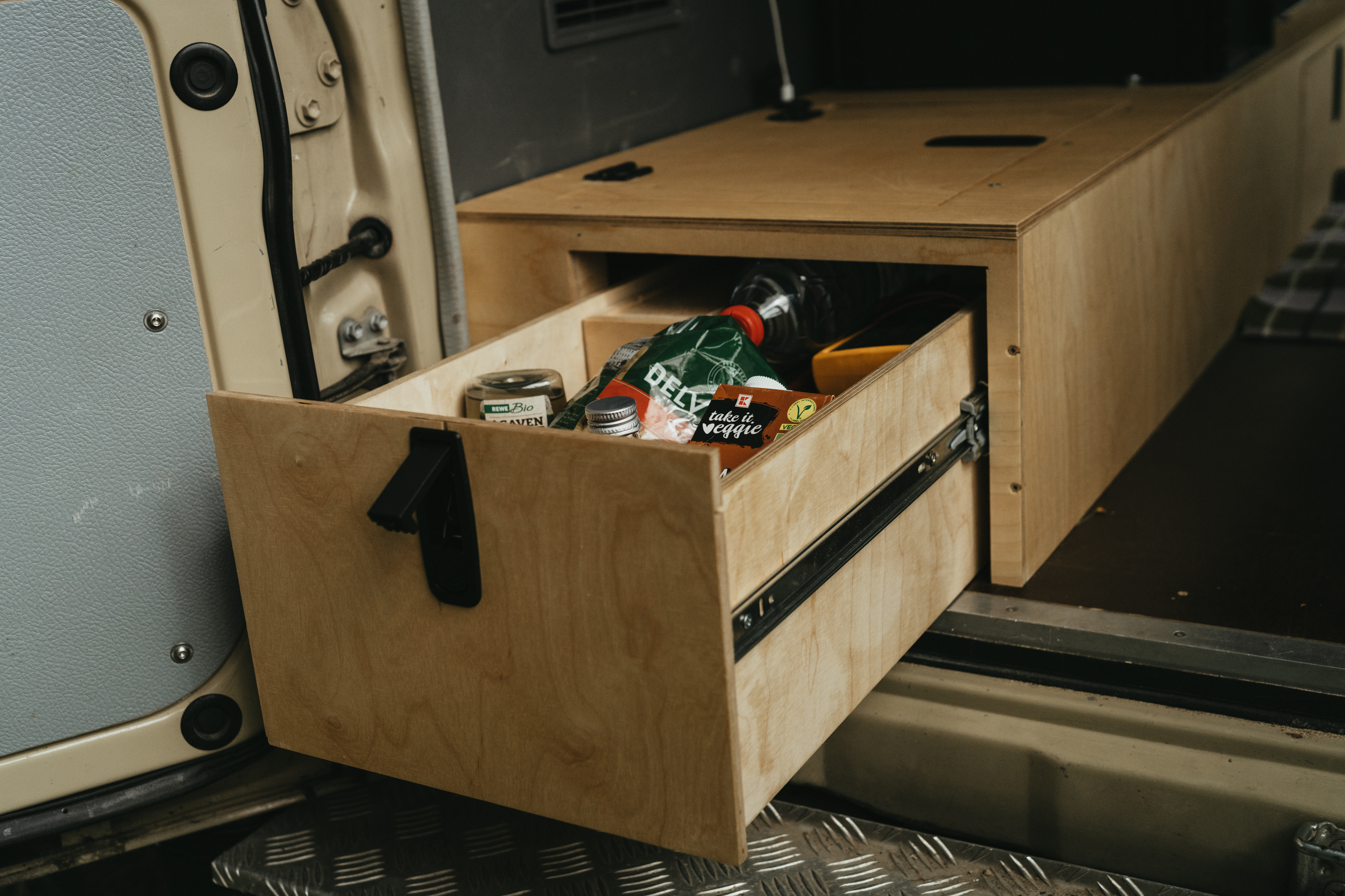 Nathan hat sich neben der perfekten Integration der Boxen noch einiges an Gedanken gemacht und viele praktische Details in seinen Ausbau integriert. So hat er am Heck eine Schublade gebaut, die er nach hinten ausziehen kann und in der Kochsachen und Lebensmittel aufbewahrt werden. Über der Schublade ist oben noch eine Klappe, sodass man auch von innen an den Inhalt der Schublade kann.