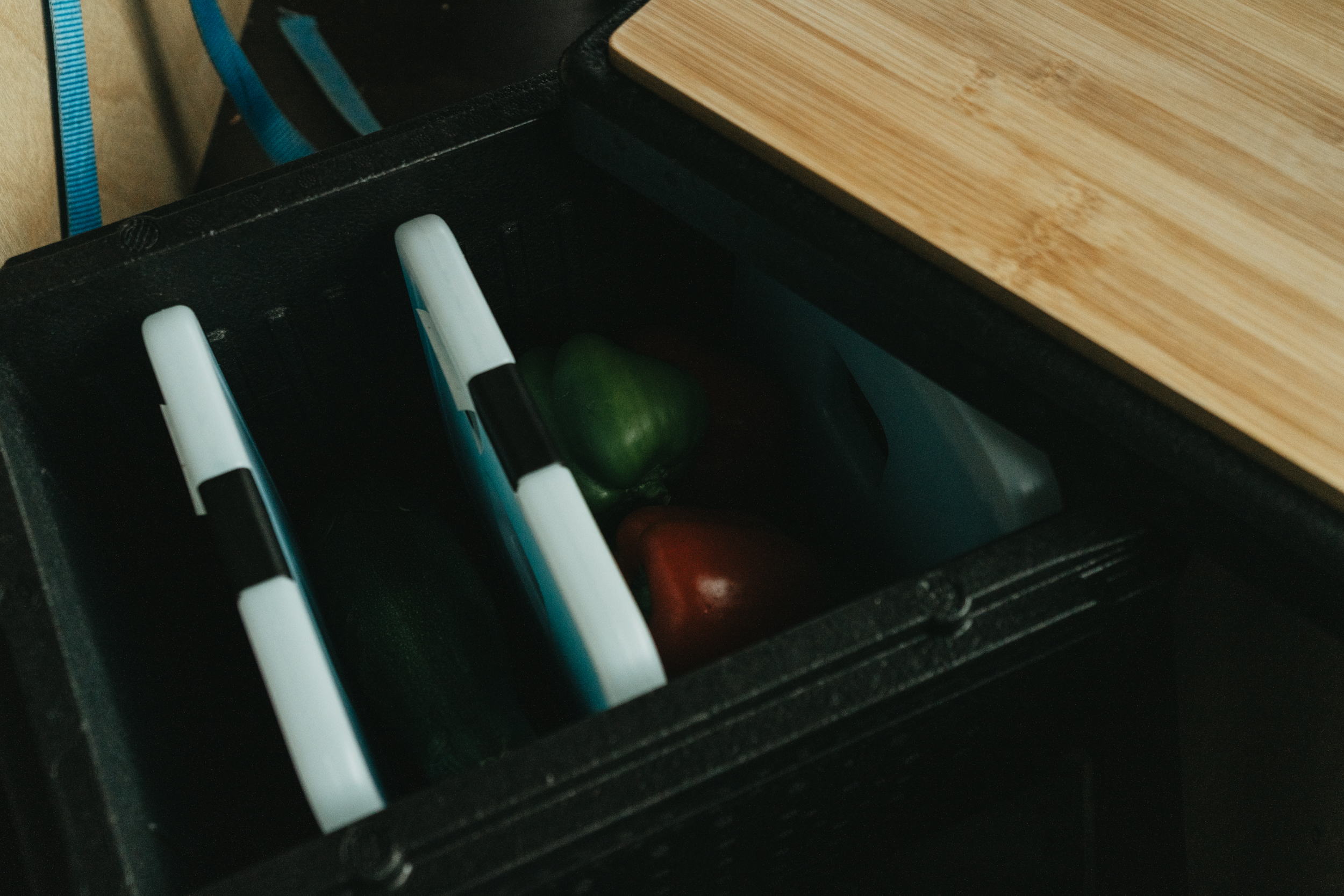 Wenn Nathan gemeinsam mit seiner Freundin kocht, dann freuen sich die zwei, dass der BOXIO TABLE eine ebenso perfekte Integration für BOXIO-Kisten hat wie der Ausbau des HZJ78. Nathan nutzt ihn als mobile Kochstation, als Spülplatz oder zum Essen. Kocher und Waschbecken passen exakt auf den Tisch. Zwischen BOXIO COOL und Kocher passt das BOXIO Board, ein kleines Schneidebrettchen, das perfekt als Deckel auf die Kühlbox passt.