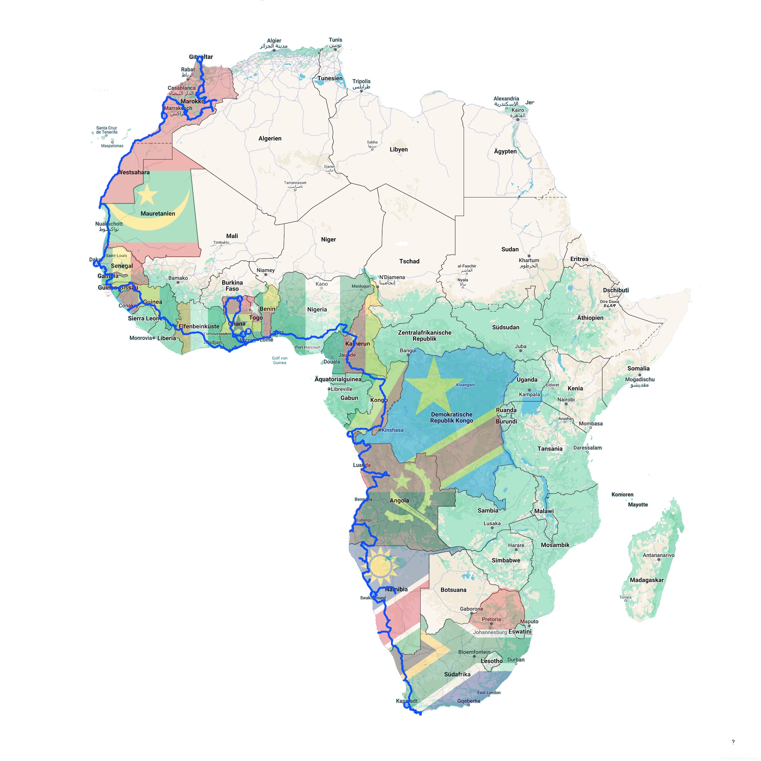 Von Deutschland ging es an den Hafen von Genua, Italien. Von dort mit der Fähre von Marokko. Immer der Westküste entlang durch Westafrika. Marokko – Mauretanien – Senegal – Gambia – Guinea-Bissau – Guinea – Elfenbeinküste – Ghana – Togo – Benin – Nigeria – Kamerun – Kongo – Demokratische Rep. Kongo – Angola – Namibia – Südafrika